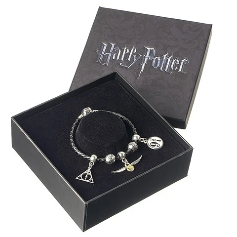 Bracelet en cuir noir avec un ensemble de charms plaqués argent Harry Potter (Reliques de la mort, Vif d’or, Quai 9 3/4) et 2 perles de sorts. Le bracelet mesure 19cm et est présenté dans un écrin