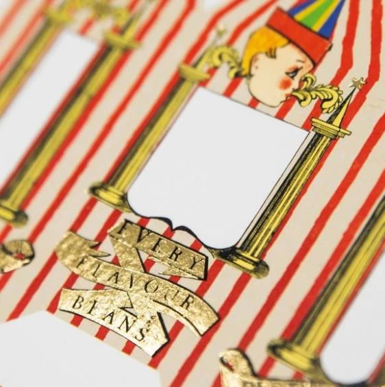 Cette carte montre le travail artistique fait pour l’emballage des Dragées Surprise de Bertie Crochue.