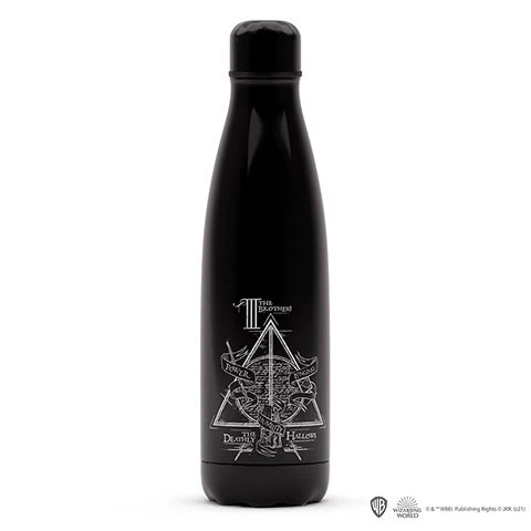 Gourde métallique isotherme illustrée des sur fond sombre. En acier inoxydable, cette bouteille gardera vos boissons fraîches ou chaudes pendant 15 heures.