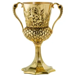 Cette réplique de la Coupe de Helga Poufsouffle est une petite coupe avec deux anses finement ciselées, ornée d’un blaireau, emblème de la maison Poufsouffle. C’est l’une des quatre reliques des fondateurs de Poudlard. Autrefois détenue par Hepzibah Smith, une des descendantes de Helga Poufsouffle, la Coupe a été transformée en horcruxe par le Seigneur des Ténèbres. Voldemort lui-même l’a confié à Bellatrix Lestrange, sa dévouée Mangemort, pour qu’elle le place en sécurité dans son coffre-fort à Gringotts. Pour la récupérer (et la détruire), Harry, Ron et Hermione affrontent bien des épreuves : l’intelligence des Gobelins, les sortilèges de protection de Gringotts, un dragon, un sortilège de duplication, … Cette réplique de la Coupe de Helga Poufsouffle compte parmi les objets incontournables d’une collection Harry Potter.