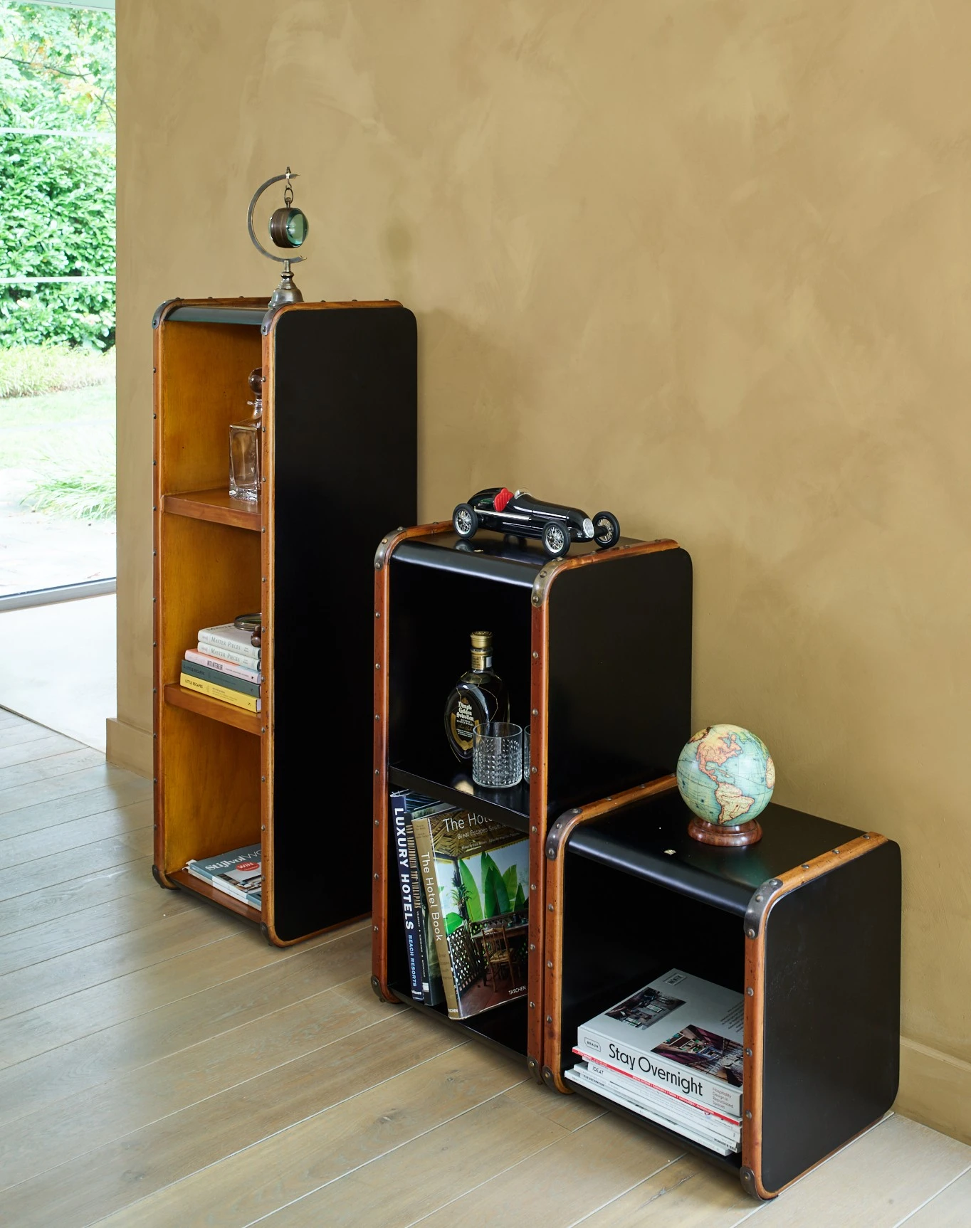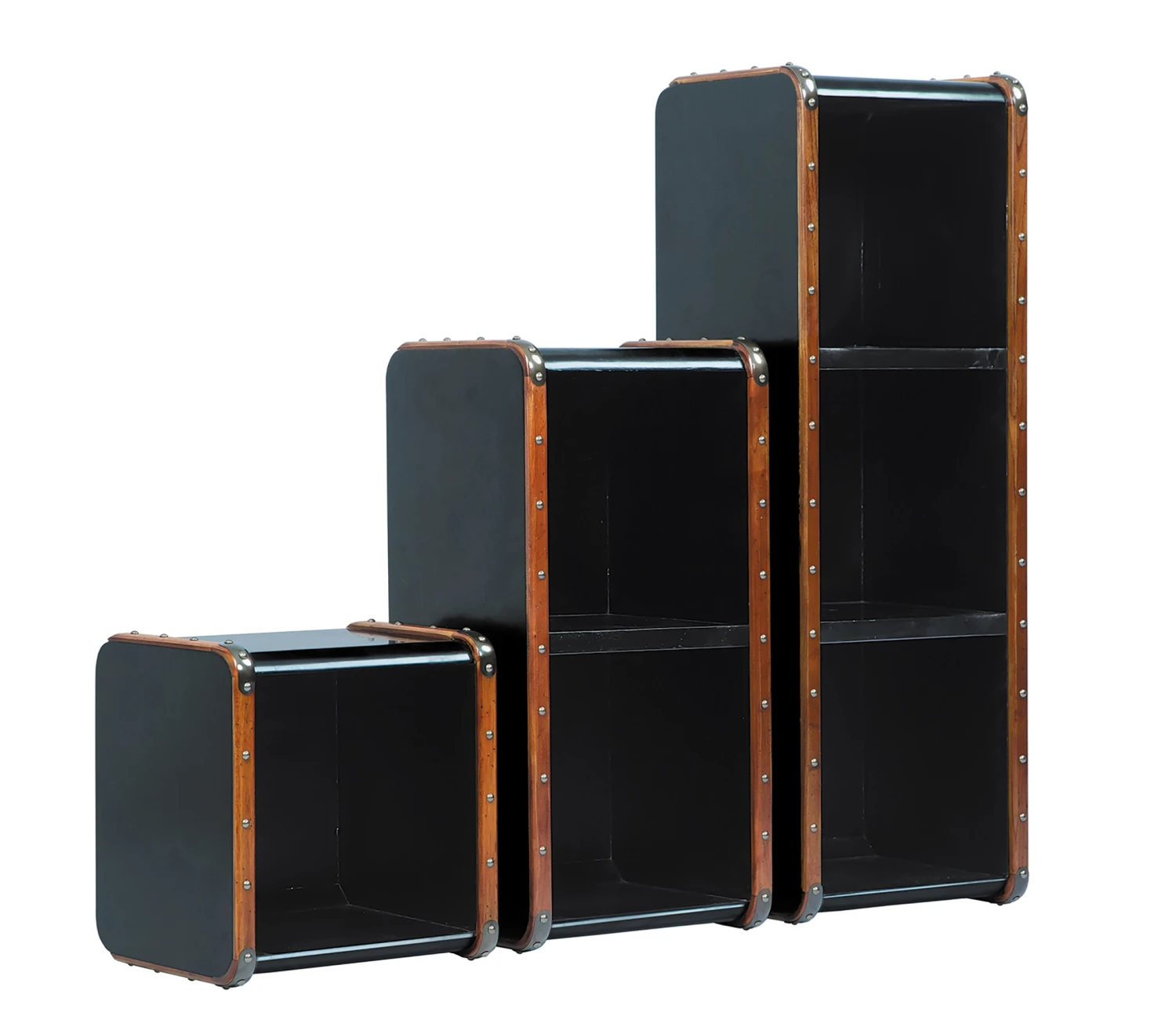 Étagère de style malle de voyage, en merisier et laiton, de trois hauteurs différentes: