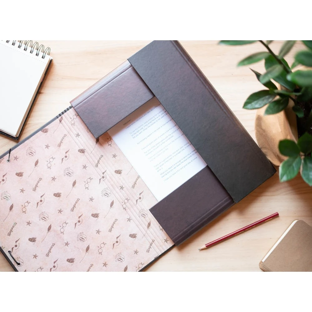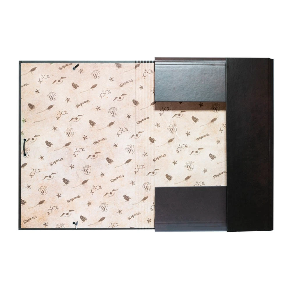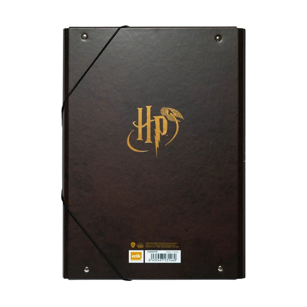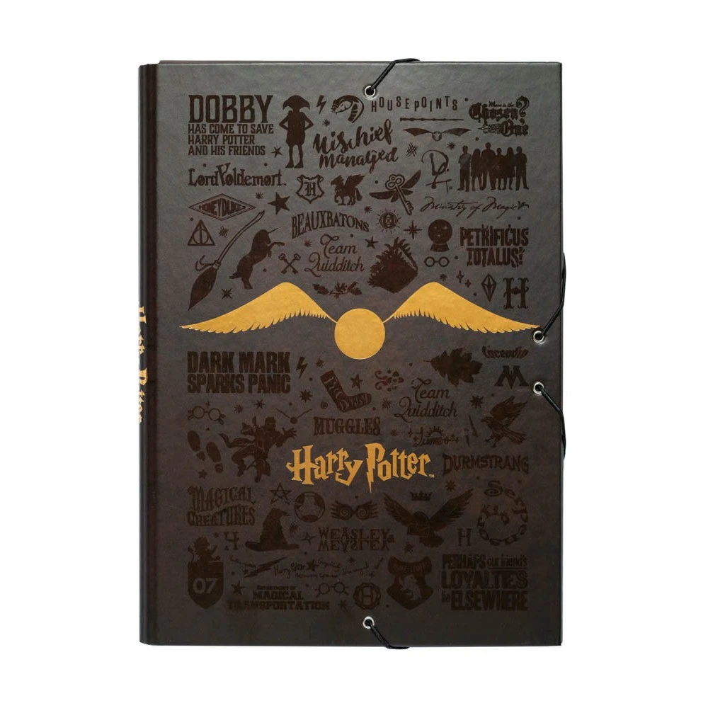 Farde à rabats Harry Potter avec élastique, munie d’une fermeture en caoutchouc élastique, une couverture rigide en carton de 2 mm d’épaisseur et doublé de papier 150 gr laminé en mat. Elle est illustrée à l’intérieur comme à l’extérieur de motifs Harry Potter et particulièrement du Vif d’Or.