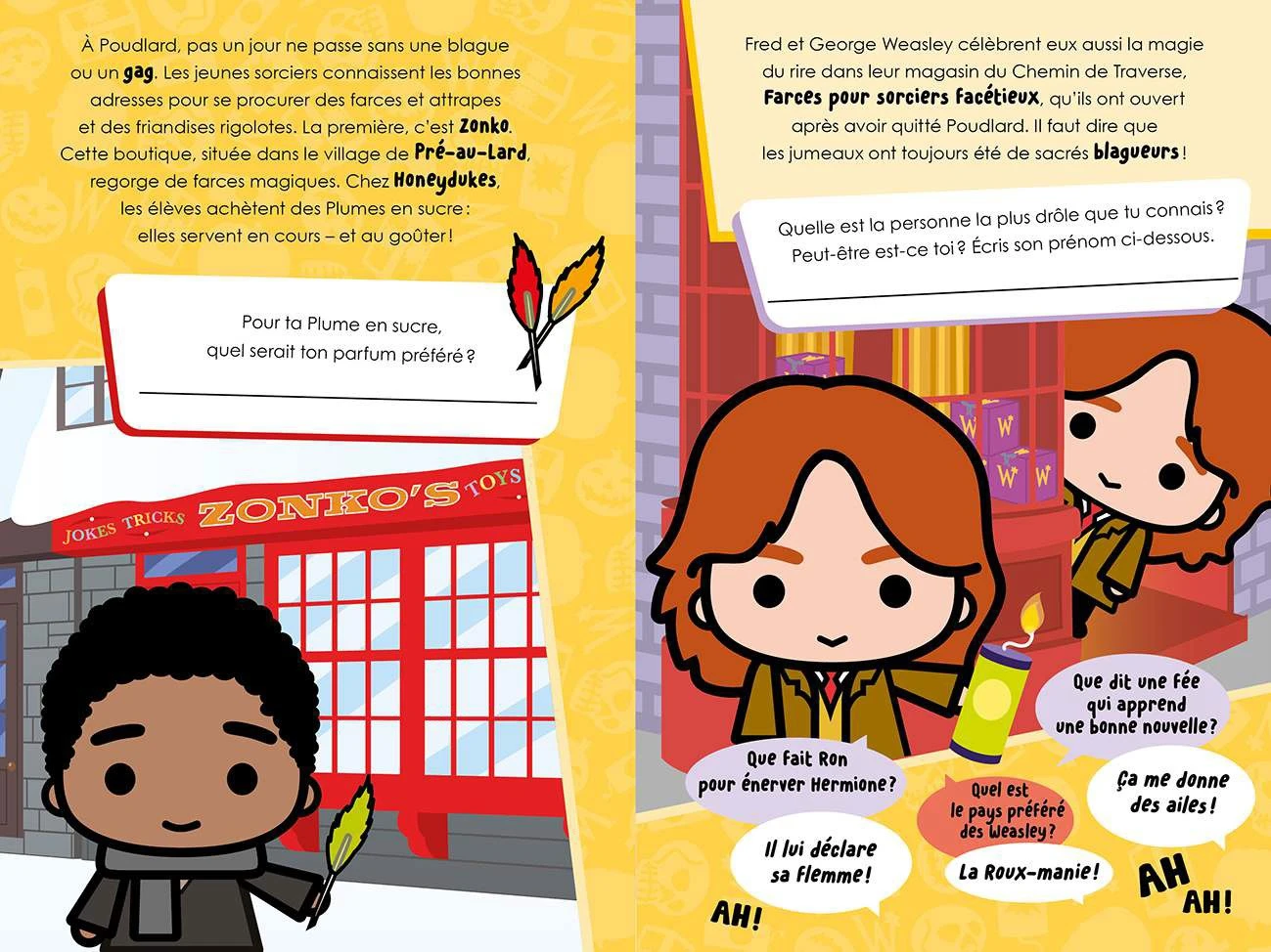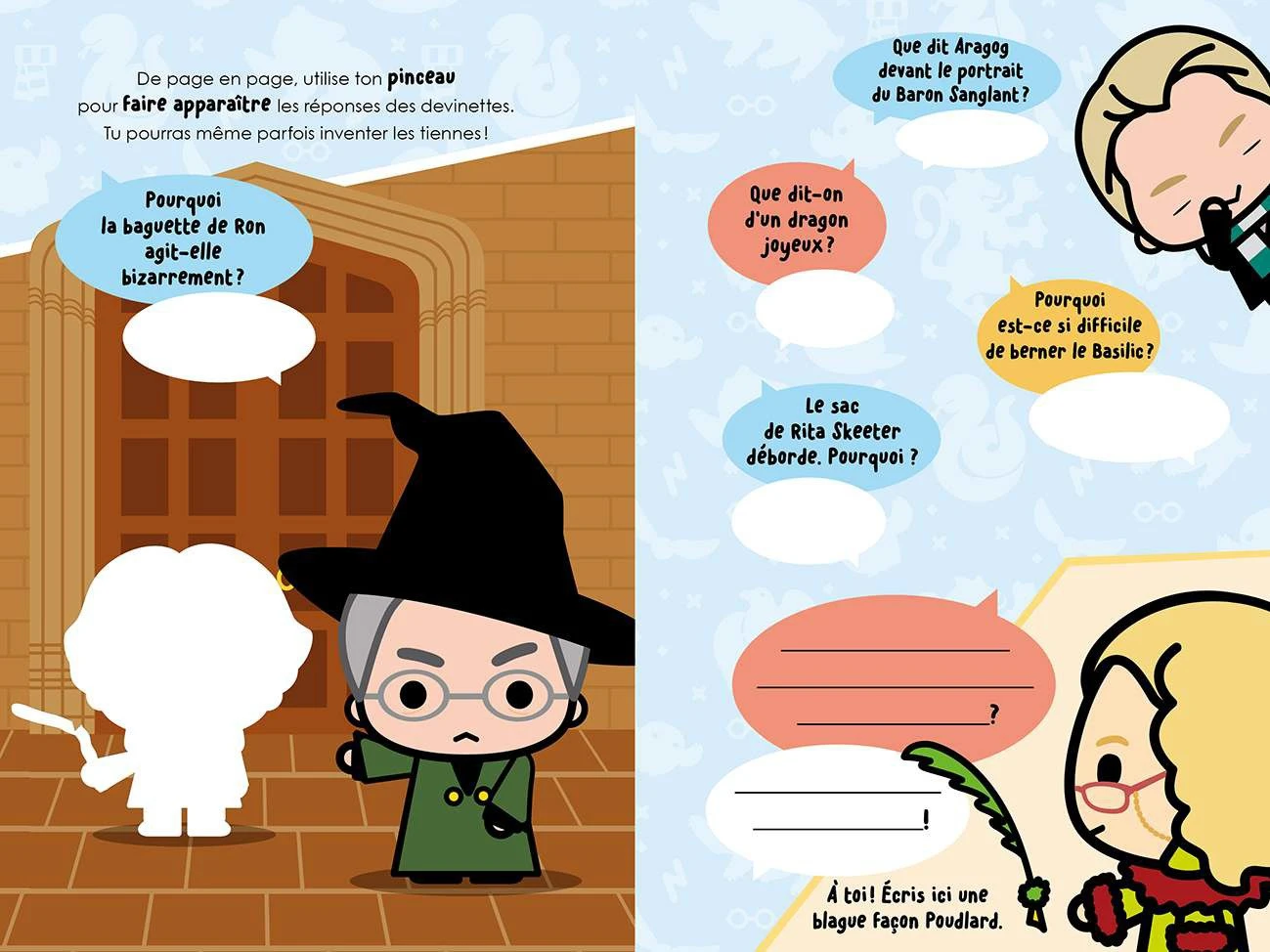 Un livre de blagues et de devinettes à destination des plus jeunes fans de Harry Potter, illustré avec une charte graphique pop et colorée, et accompagné d’un pinceau magique.