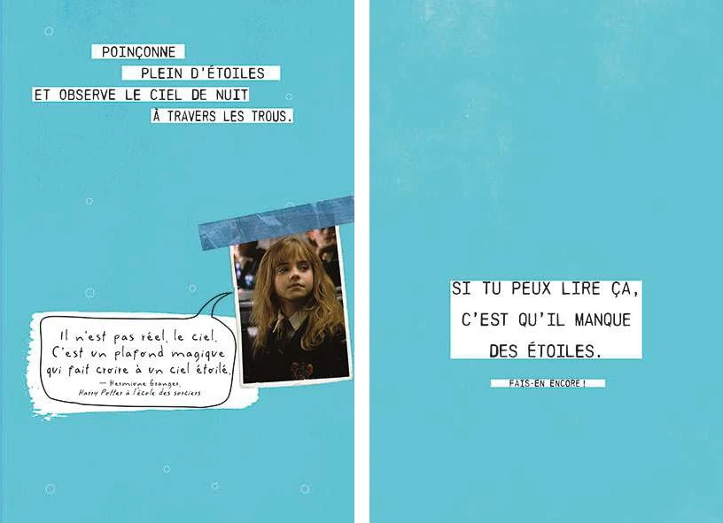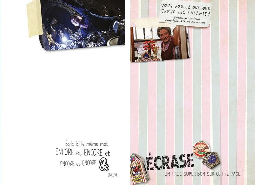 Pour faire un sort à la mauvaise humeur ou iuste pour le plaisir, plus de 100 activités créatives ou destructrices, à faire avec le livre : le ieter, le mouiller, l’écraser, le secouer, crier dessus, et à chaque page : gribouiller compulsivement ou colorier soigneusement, découper ou déchirer rageusement, recoller ici ou là, froisser, plier, défroisser, recouvrir de papiers de bonbons, d’encre, d’un truc gluant…