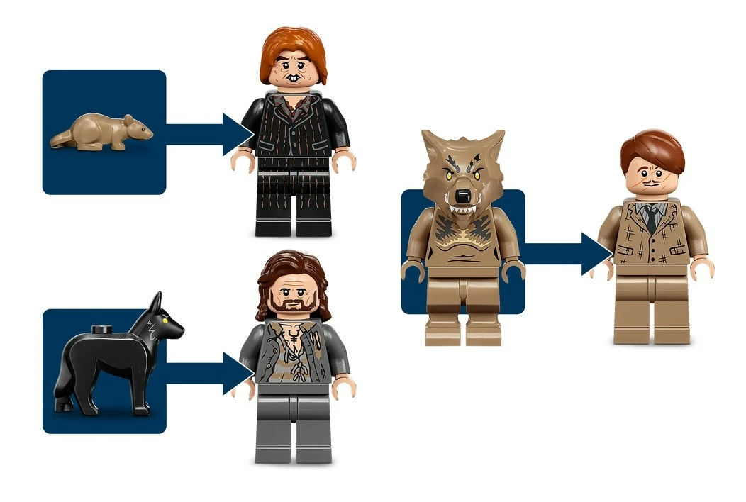- Minifigurines iconiques – Harry Potter™, Hermione Granger™, Ron Weasley™, Sirius Black™, Peter Pettigrow et Remus Lupin. 4 tuiles cartes de sorciers aléatoires (sur 16 au total) sont également incluses pour enrichir la collection des enfants