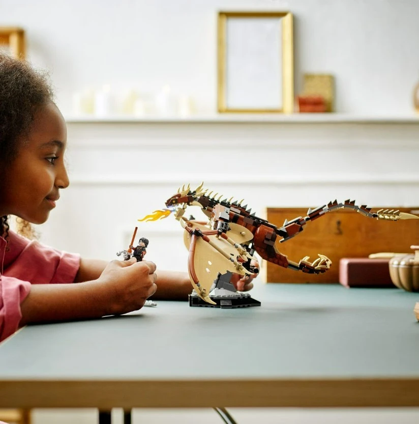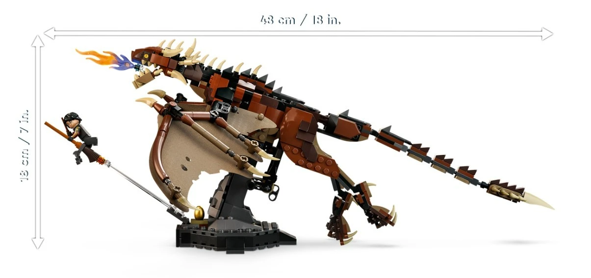 - Détails envoûtants – Le modèle réaliste inclut une minifigurine de Harry Potter™ chevauchant l’Éclair de feu, son balai magique, et un œuf d’or du Tournoi des Trois Sorciers. La membrane des ailes est représentée en textile
