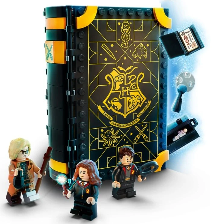 La couverture décorée cache une salle de classe pleine d’aventures magiques qui contient 3 minifigurines (Maugrey Fol Œil, Hermione Granger™ et Neville Londubat) et des accessoires amusants. Certains éléments sont intégrés, comme les étagères et la cheminée, d’autres détachés comme le tableau, la malle, les potions, le bureau et les chaises, et se retirent pour agrandir l’espace. Les éléments du set se combinent avec tous les jouets de la gamme et se glissent dans le livre fermé pour être emportés partout ou rangés jusqu’à la prochaine leçon.