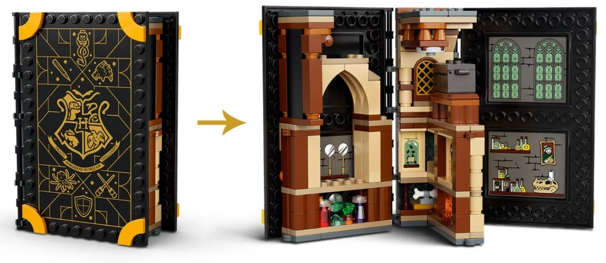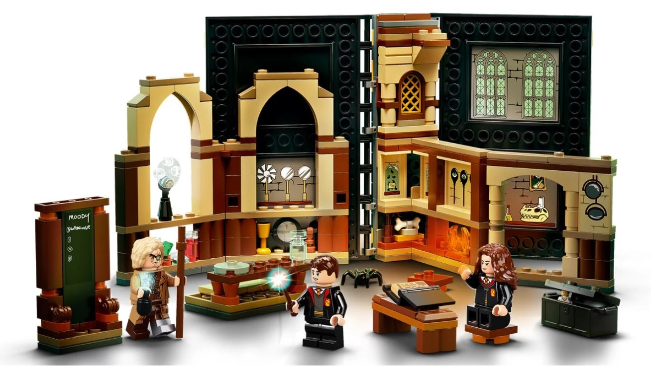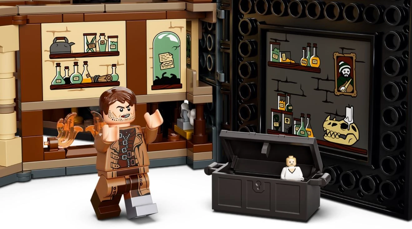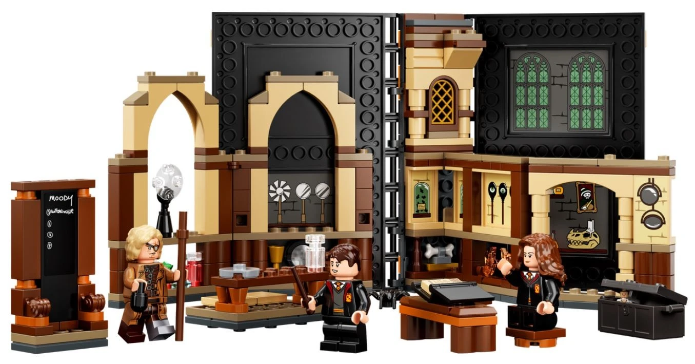 - Salle de cours de Poudlard – Inclut les minifigurines de Maugrey Fol Œil, Hermione Granger™ et Neville Londubat, ainsi que de nombreux accessoires authentiques, dont un tableau, une malle, des fioles de potion, un bureau et des chaises