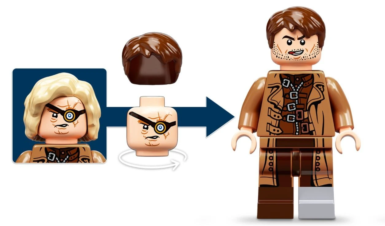 - Comme dans les films – La minifigurine de Maugrey Fol Œil se transforme en Barty Croupton Jr. en retournant sa tête et en remplaçant ses cheveux. La malle contient une microfigurine représentant le véritable Maugrey Fol Œil