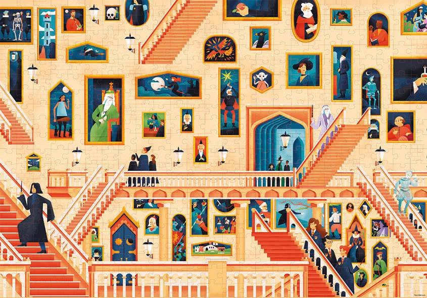 L’illustration élégante du Studio Muti pour un puzzle format affiche accompagné d’un livret pour découvrir les secrets de l’école, de la Forêt Interdite au terrain de Quidditch en passant par Pré-au-Lard.