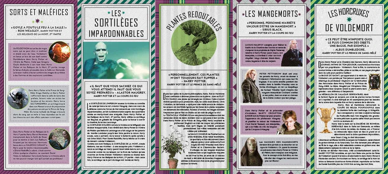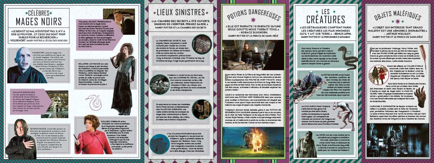 Une incursion inédite dans les tréfonds de la magie noire, des célèbres professeurs de défense contre les forces du Mal et les Mangemorts les plus redoutables jusqu’aux maléfiques créatures des ténèbres et aux Sorts impardonnables.