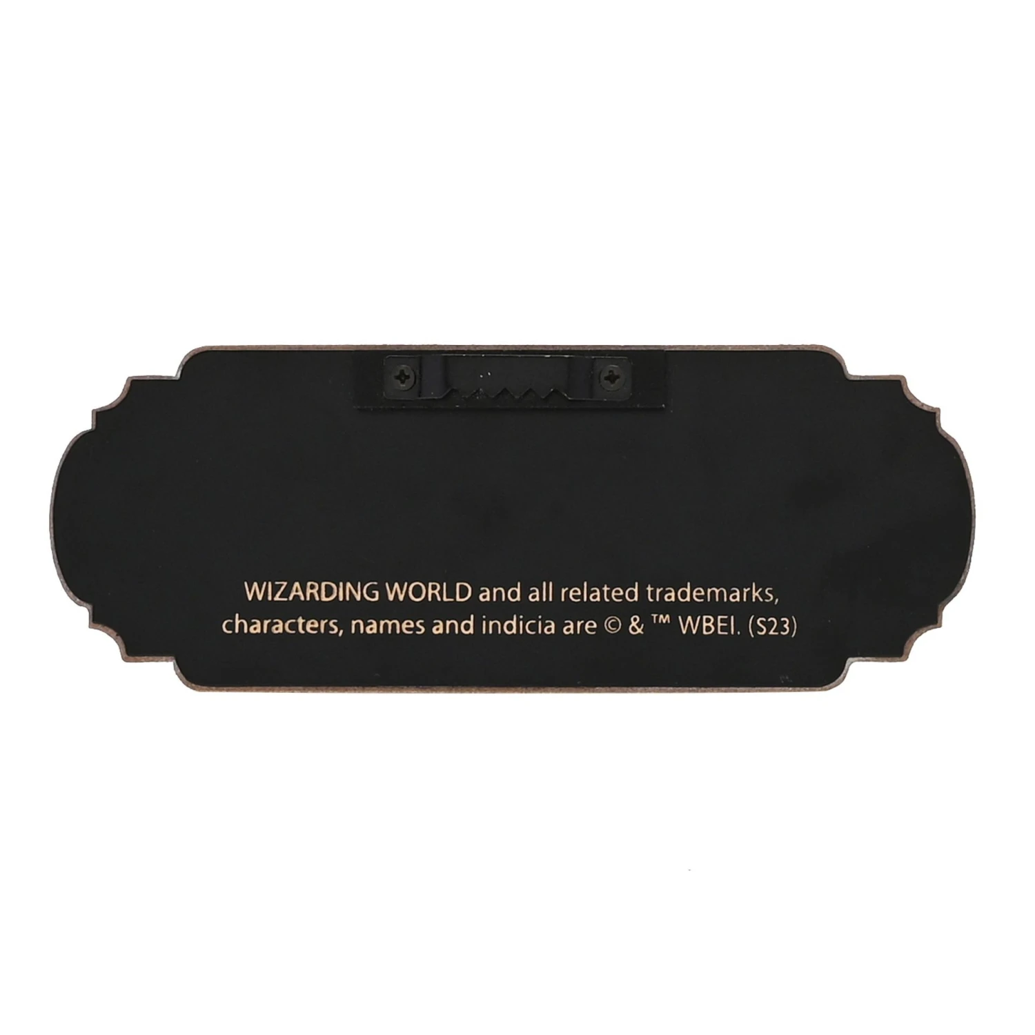 Le panneau en métal noir présente un design étoilé « brillant dans le noir », complété par le titre doré « Expelliarmus », l’inscription blanche « The Disarming Charm » – qui brille également dans le noir – et une finition à effet métallique. Il est complété par une bordure en bois doré et un crochet pour affichage mural.