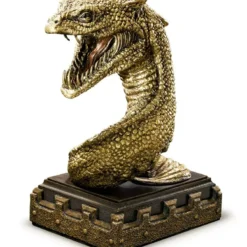 Ce serre-livres représente la tête du Basilic qu’affronte Harry dans la Chambre des Secrets. Le Basilic est un serpent géant extrêmement venimeux, souvent surnommé “Roi des Serpents”. Cette créature maléfique a le pouvoir de tuer quiconque le regarde dans les yeux. Ses longs crochets injectent un venin mortel à ses proies. Le seul remède connu est une larme de Phénix, une substance extrêmement rare.
